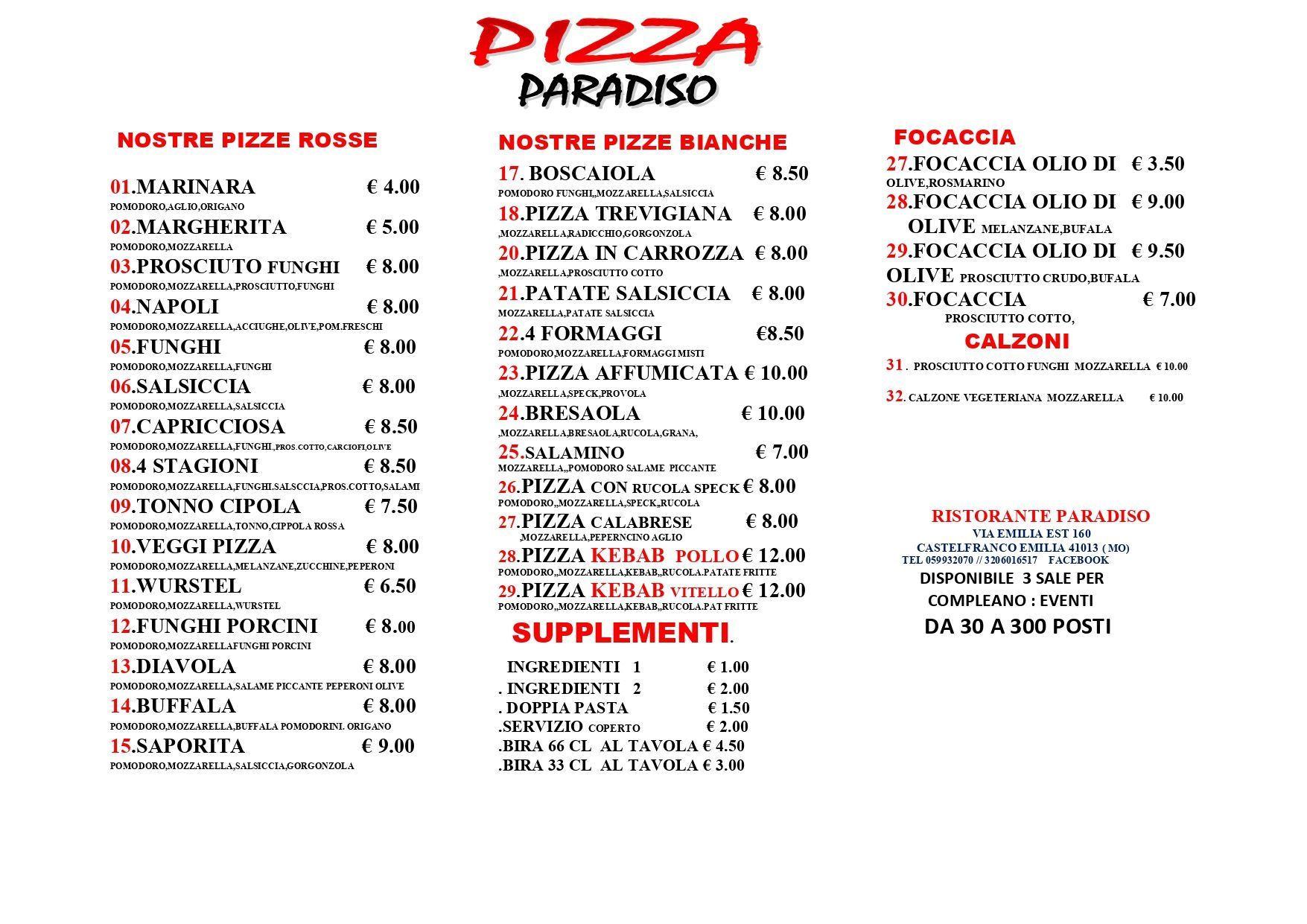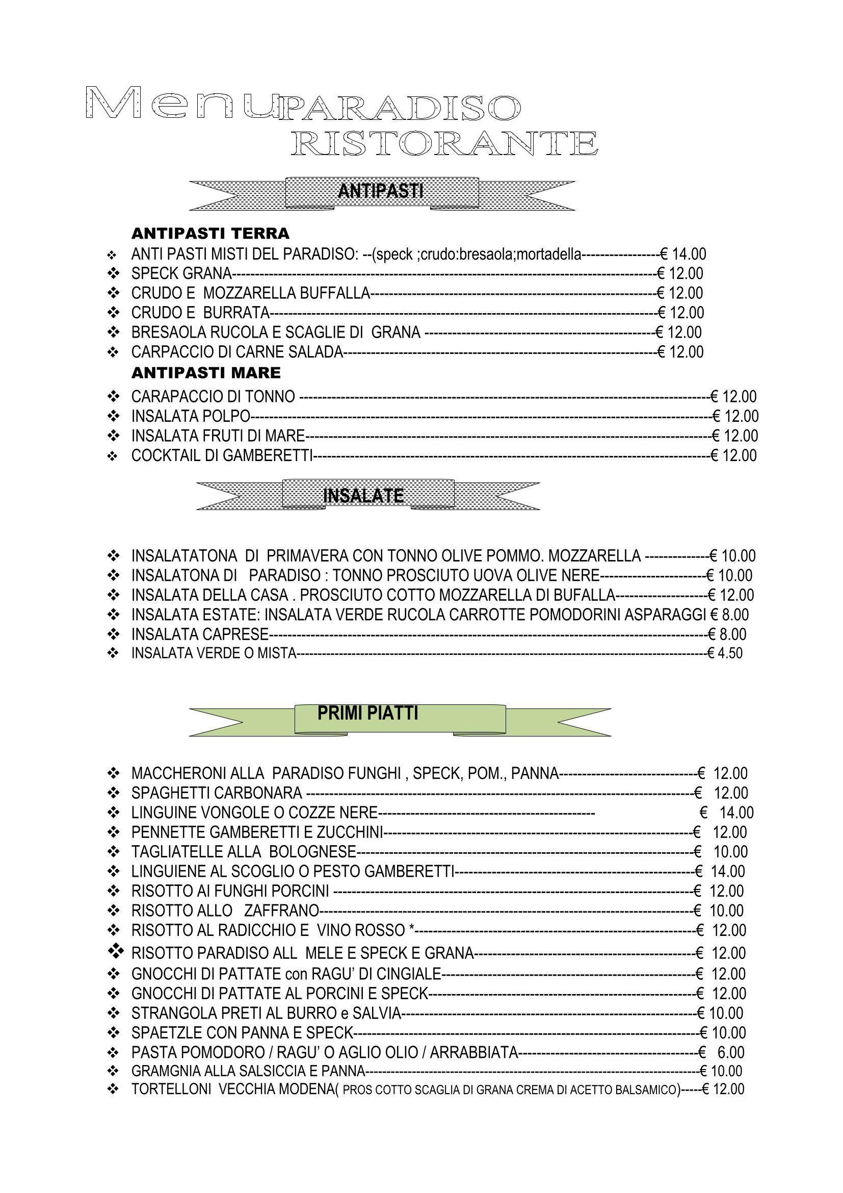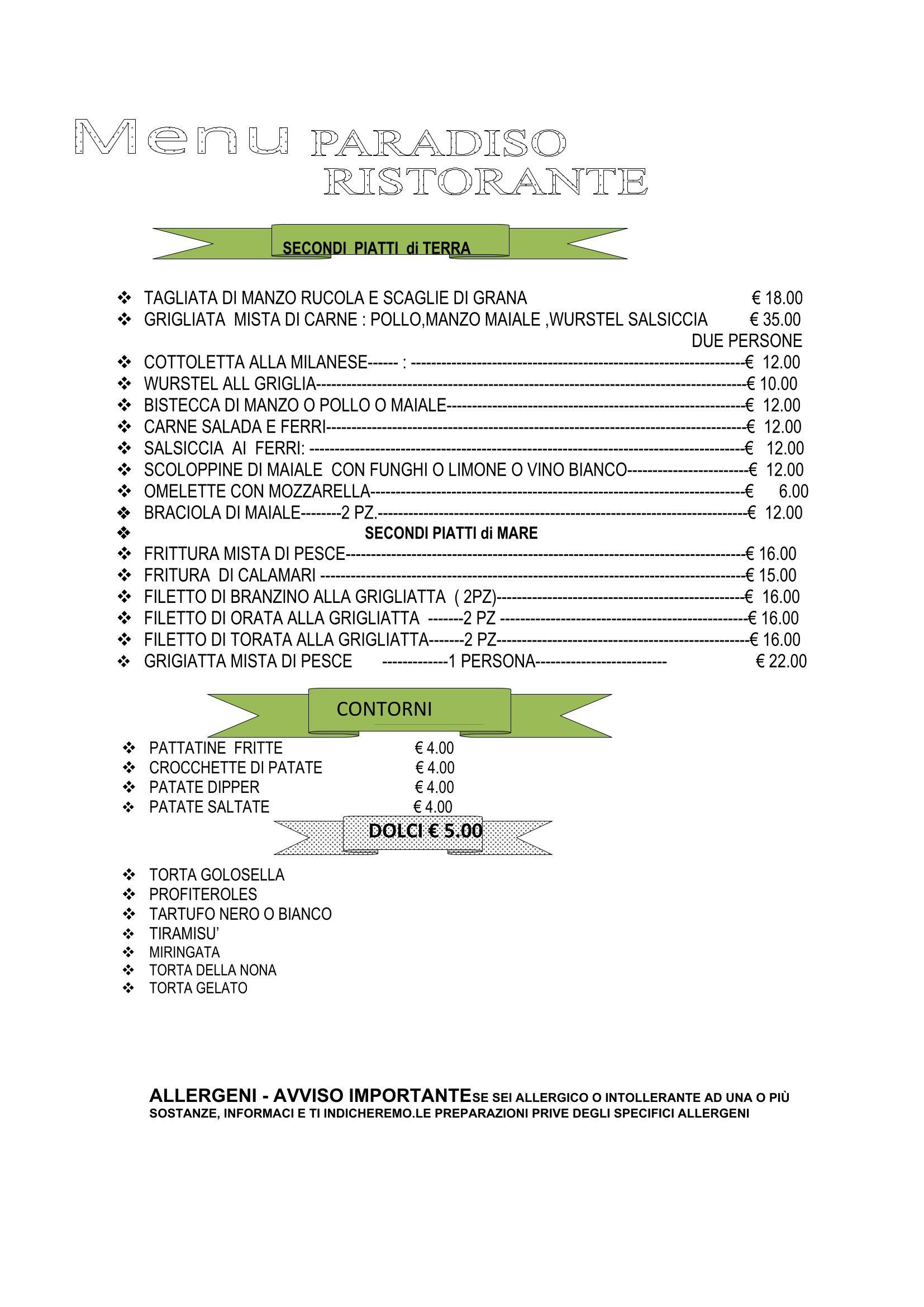 Composto da primo, secondo, contorno, 1/2acqua, Caffè, 1/4vino o bibita
